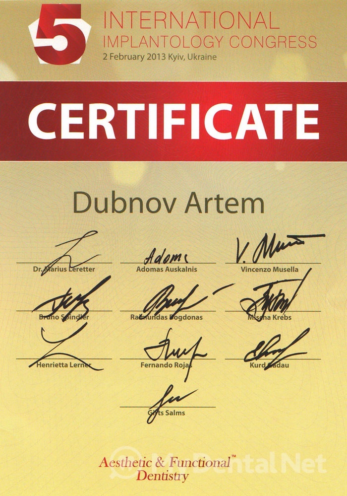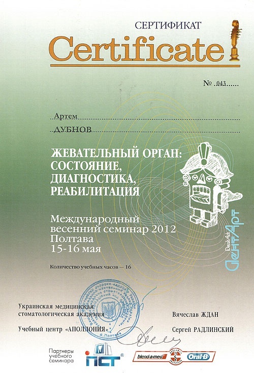 Physician & ndash; maxillofacial and orthognathic surgery, Implantology Member of the Association of Ukraine, member of the Association of Cranio-facial surgeons Max-Ukraine, Member of the International Congress of Oral Implantologists, Member of the International Team of Implantology, Member of the German Association of Implantology, International Team of Implantology study club member
