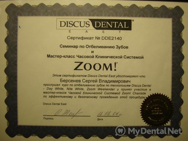 13.08.2006 прослушал курс по Отбеливанию зубов и принял участие в мастер-классе Часовой Клинической Системы ZOOM! (сертификат № DDE2140) г.Москва.