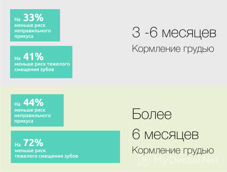 Аналогично у детей, которые находились на грудном вскармливании в течении 3 – 6 месяцев риск тяжелого смещения зубов снижался на 41%, а при грудном вскармливании больше 6 месяцев этот риск меньше на 72%.