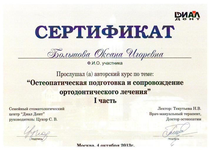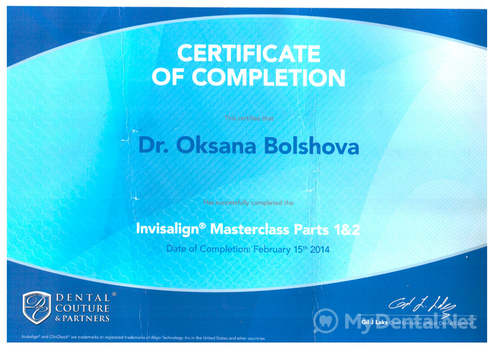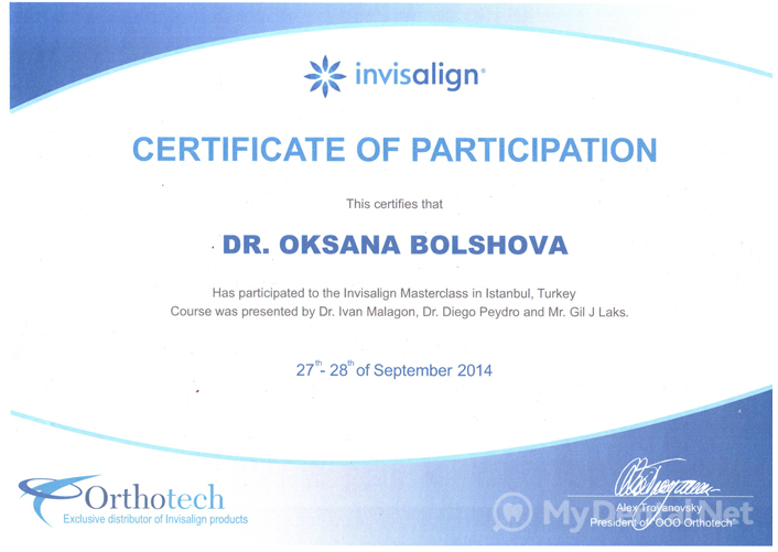 В 2013 году О.И. Большова одной из первых в России прошла сертификацию по системе лечения Инвизилайн и получила звание эксперта. Инвизилайн — это уникальная система, которая позволяет исправлять прикус незаметно и эффективно с помощью комплекта точно рассчитанных сменных индивидуальных капп. Статус эксперта служит гарантией для пациентов, что врач применяет систему правильно. Сертификат выдала компания «Ортотэк» — эксклюзивный дистрибьютор «Invisalign» на территории России, СНГ и стран Балтии. "