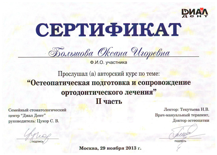 По принципу комплексного подхода в лечении, когда придя за помощью к стоматологу-ортодонту, человек имеет возможность получить понятную, развернутую и согласованную консультацию сразу от нескольких смежных специалистов, когда все лечение разработано от начала до конца, работает "Ортодонт-проект Ольги Барановой", реализованный в отделении ортодонтии в Семейном стоматологическом центре «Диал-Дент». Разделяя этот принцип Большова О.И. пришла в команду ортодонта Барановой О.А. чтобы все свои знания направить на здоровье пациентов.