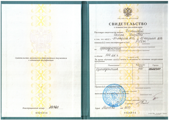 Чтобы следить за новыми тенденциями и исследованиями Оксана Игоревна принимает участие в специализированных конгрессах, семинарах и симпозиумах. Для себя она особенно выделяет Европейский съезд ортодонтов в Вене и курс врача С.Р. Булатовой - специалиста по систематизации и углублению профессиональных знаний.