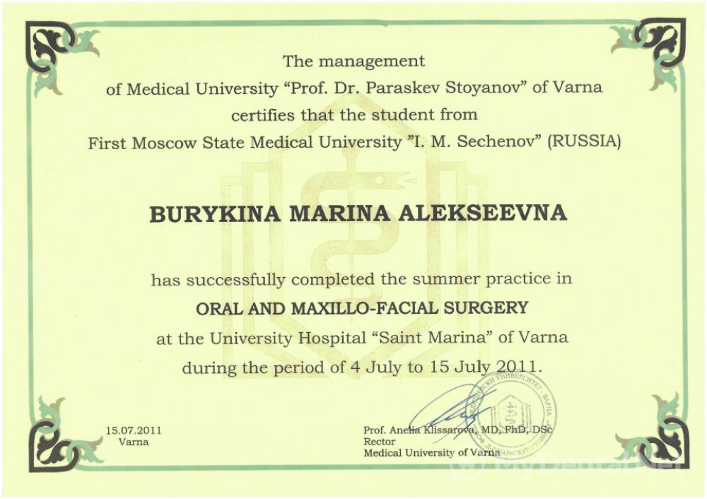 Квалификация:2011 г. – Практика по челюстно-лицевой хирургической стоматологии на базе университетского госпиталя г. Варна, Болгария