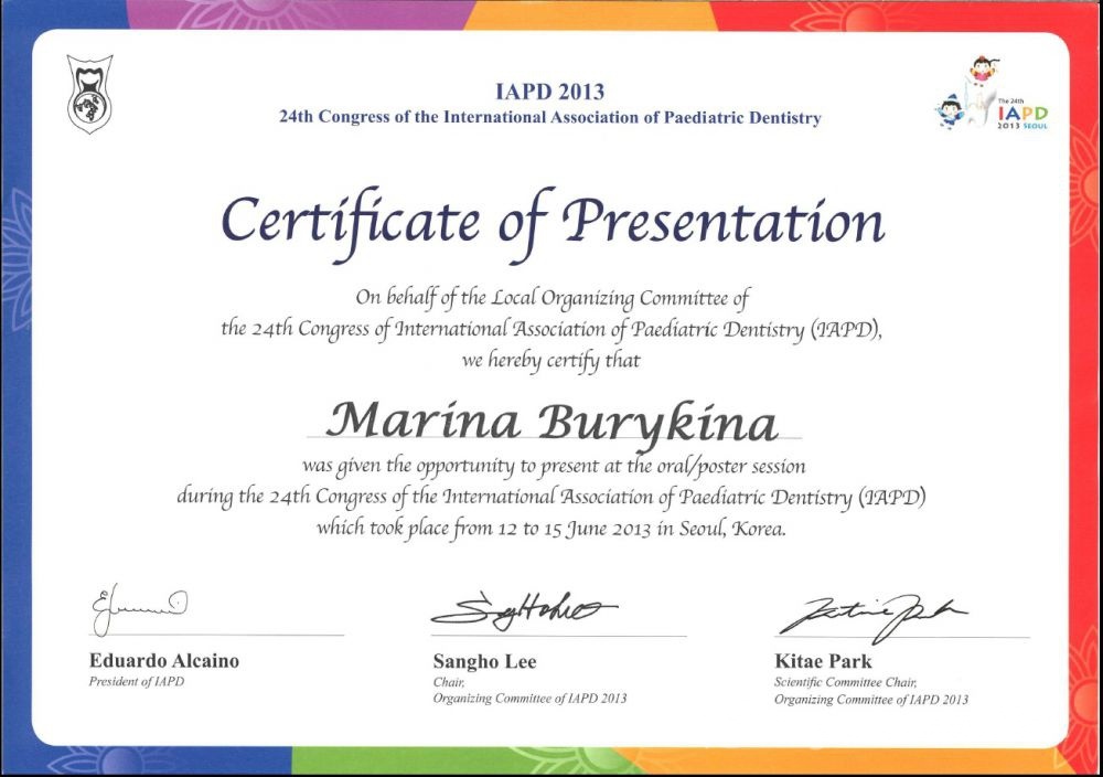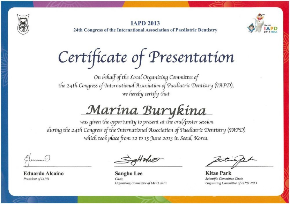 2013 г. – докладчик 24 международного конгресса Международной Ассоциации Детских Стоматологов (IAPD), г. Сеул, Южная Корея.
