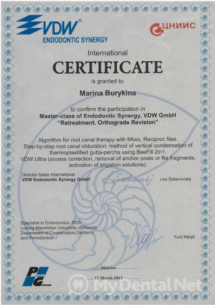 2013 г. – Master-class of Endodontic Synergy, VDW GmbH «Retreatment. Orthograde Revision»