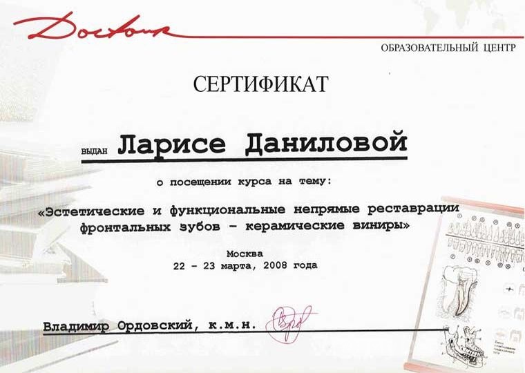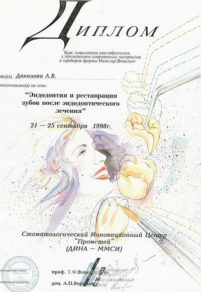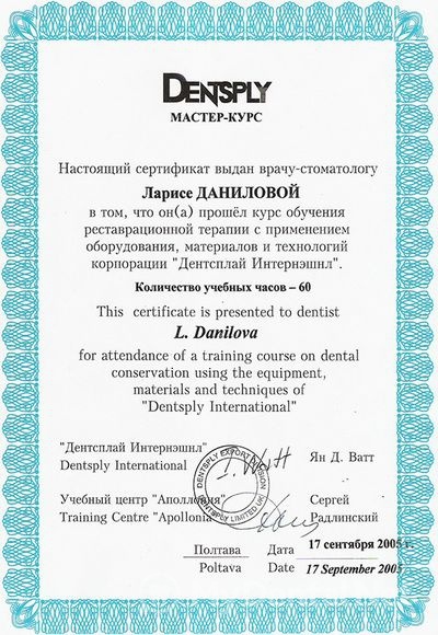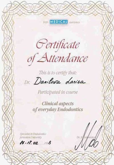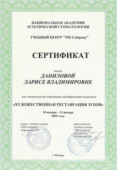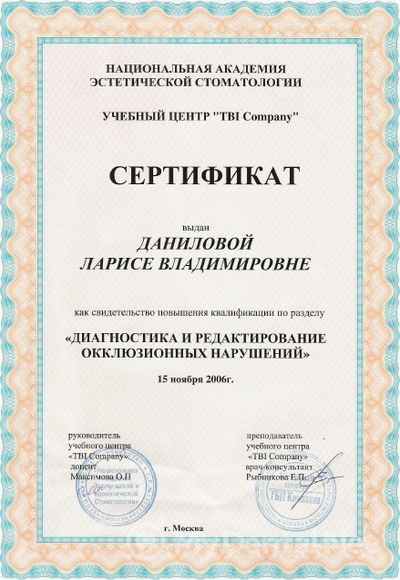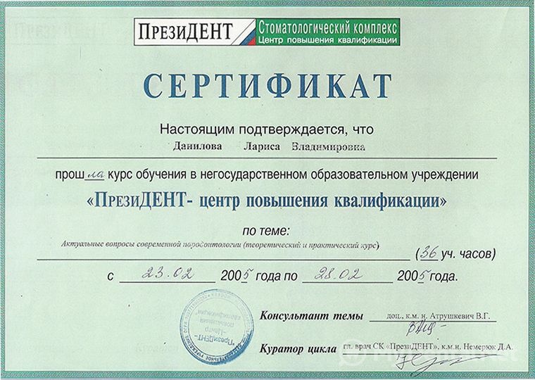Квалификация: Сертификат РУДН (терапевтическая стоматология), Диплом ДИНА-ММСИ (эндодонтия и реставрация зубов), Сертификат Национальной Академии эстетической стоматологии (художественная реставрация зубов), Диплом Президент-центр повышения квалификации (современная пародонтология), Сертификат Dentsply International USA (мастер-курс по реставрационной терапии), Сертификат Национальной Академии эстетической стоматологии (диагностика и редактирование окклюзионных нарушений), Сертификат Medical Consulting Group (клинические аспекты эндодонтии), Сертификат образовательного Центра Doctour “Эстетические и функциональные непрямые реставрации фронтальных зубов – керамические виниры”.