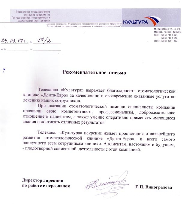 Рекомендательное письмо телеканала "Культура" Телеканал «Культура» выражает благодарность стоматологической клинике «Дента-Евро» за качественно и своевременно оказанные услуги по лечению наших сотрудников.
