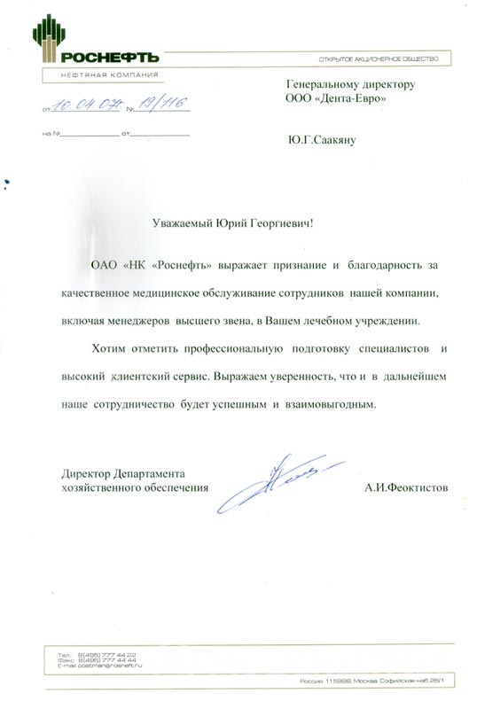Благодарность от компании ОАО "НК Роснефть" ОАО НК Роснефть выражает признание и благодарность за качественное медицинское обслуживание сотрудников нашей компании, включая менеджеров высшего звена.