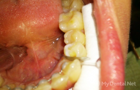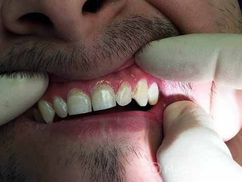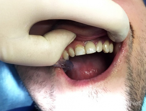 Пациенту была проведена Профессиональная гигиена - ультразвуковая чистка зубов, сняты камни и налет. После чего оголилась пришеечная часть фронтальных зубов.