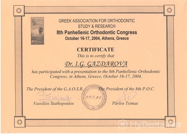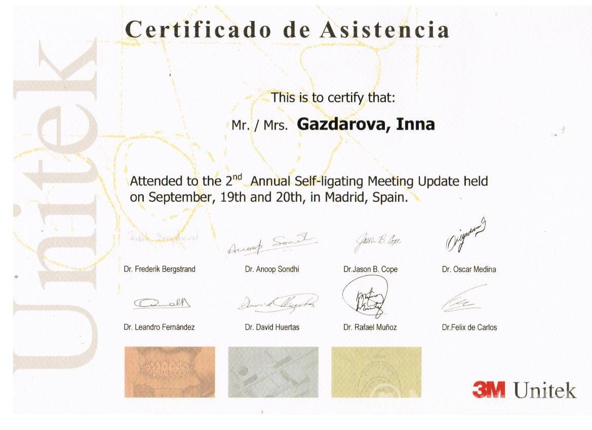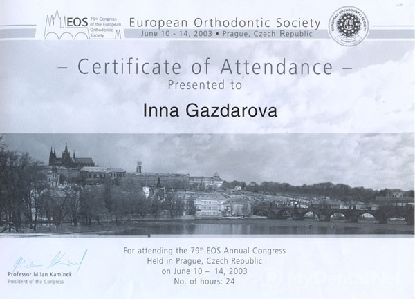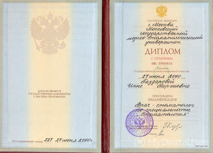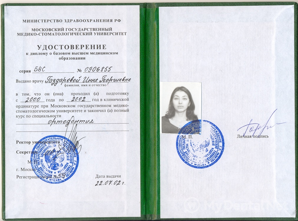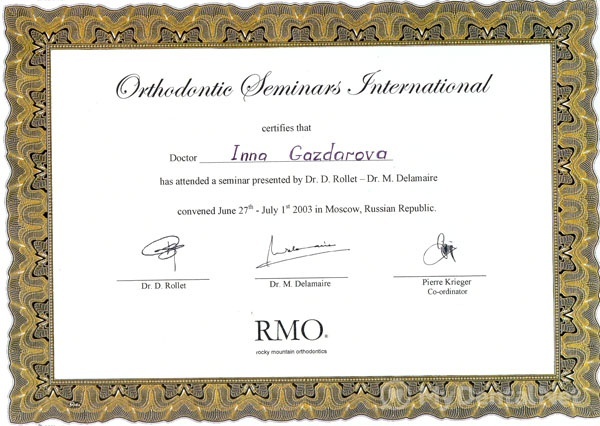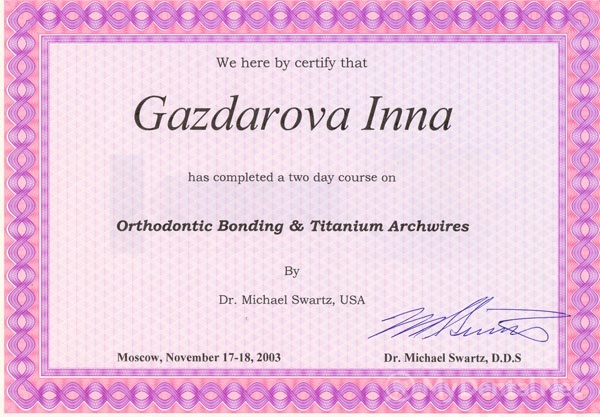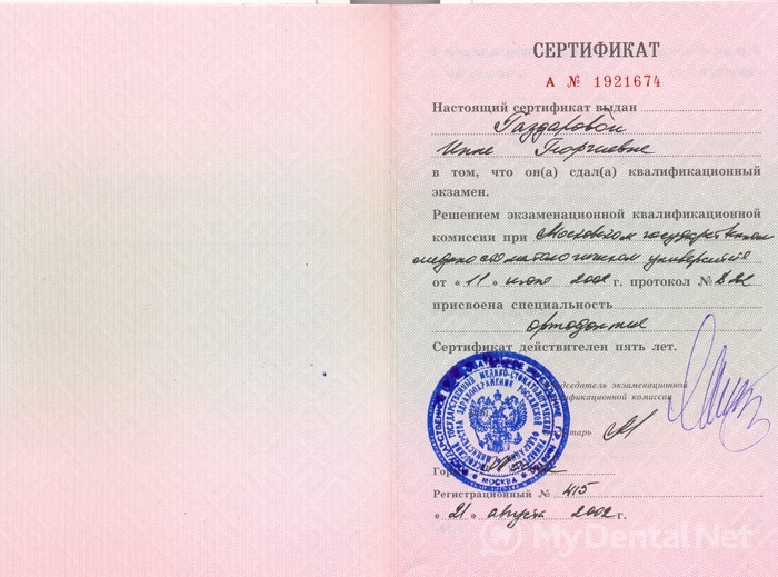 Имеет сертификат о получении специальности "Ортодонтия" (ординатура Московского государственного медико-стоматологического университета , 2002 год).