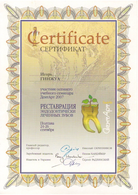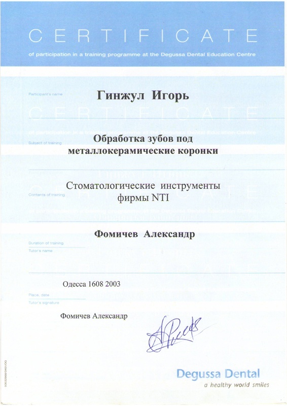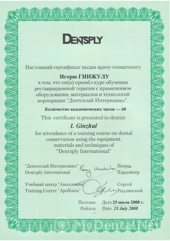 1991-1994 гг. — Одесское медицинское училище №3; 1994-1999 гг. — Одесский медицинский университет им. Пирогова (стоматологический факультет); 1999-2001 гг. – интернатура ГСП №5 (специальность-стоматология); 2001-2008 гг. – врач-стоматолог (терапевт) ГСП №2; 2002-2007 гг. – частная клиника «Стоматологическая помощь» ( специальность- имплантология); 2007 г. – частная стоматология- «Респект»; 2008 г. – клиника Американской стоматологии Excelline.