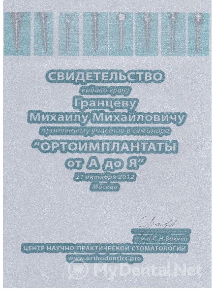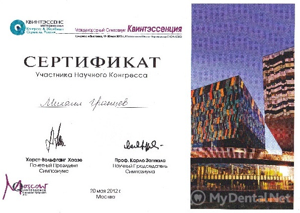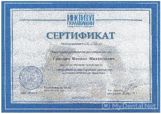 С 2011 по 2012 года проходил профессиональную переподготовку по специальности "стоматология хирургическая" с получение соответствующего сертификата.