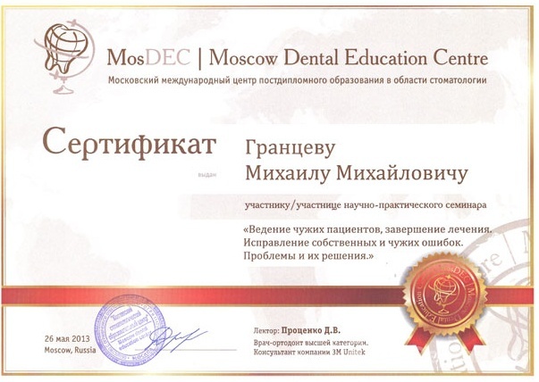 1.«Ведение чужих пациентов, завершение лечения. Исправление собственных и чужих ошибок. Проблемы и их решения». Проценко Денис Владимирович 26 мая 2013 год, г. Москва.