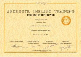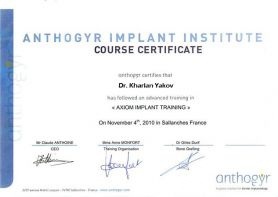 В 2004 году прошел сертификационный курс по работе с имплантационной системой Anthogyr (Франция).