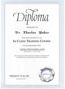 В 2008 году прошел сертификационный курс с мастер классом по теме «Применение имплантационной системы Astra Tech в различных клинических ситуациях».
