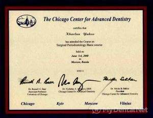 В 2007 году прошел сертификационный курс на тему: «Новые технологии в стоматологической имплантологии.» у профессора Иванова Сергея Юрьевича.