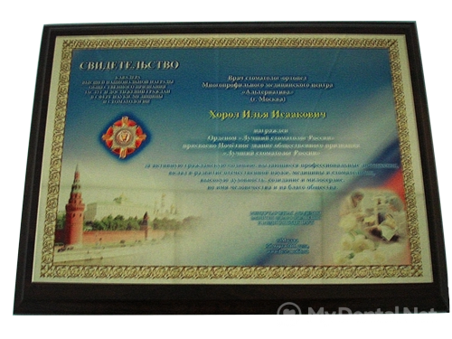 ВРАЧ СТОМАТОЛОГ - ОРТОПЕД МНОГОПРОФИЛЬНОГО МЕДИЦИНСКОГО ЦЕНТРА "АЛЬТЕРНАТИВА" ХОРОЛ ИЛЬЯ ИСААКОВИЧ НАГРАЖДЁН ОРДЕНОМ "ЛУЧШИЙ СТОМАТОЛОГ РОССИИ"