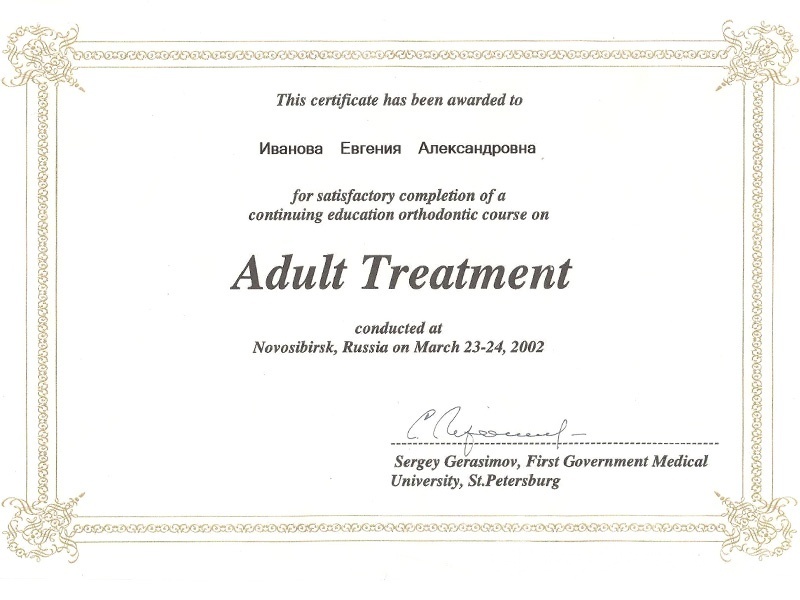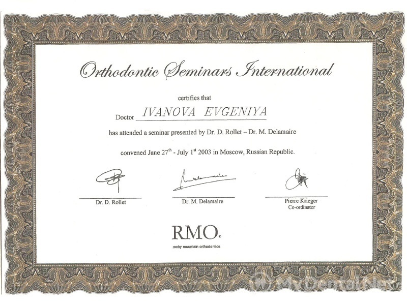 2001 г. — первичная специализация по ортодонтии, присвоена квалификация врача стоматолога ортодонта.