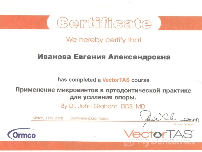 2008 г. — семинар «Применение микроимплантатов системы Vector TAS в ортодонтической практике для создания опоры», Dr. John Graham, DDS, MD.