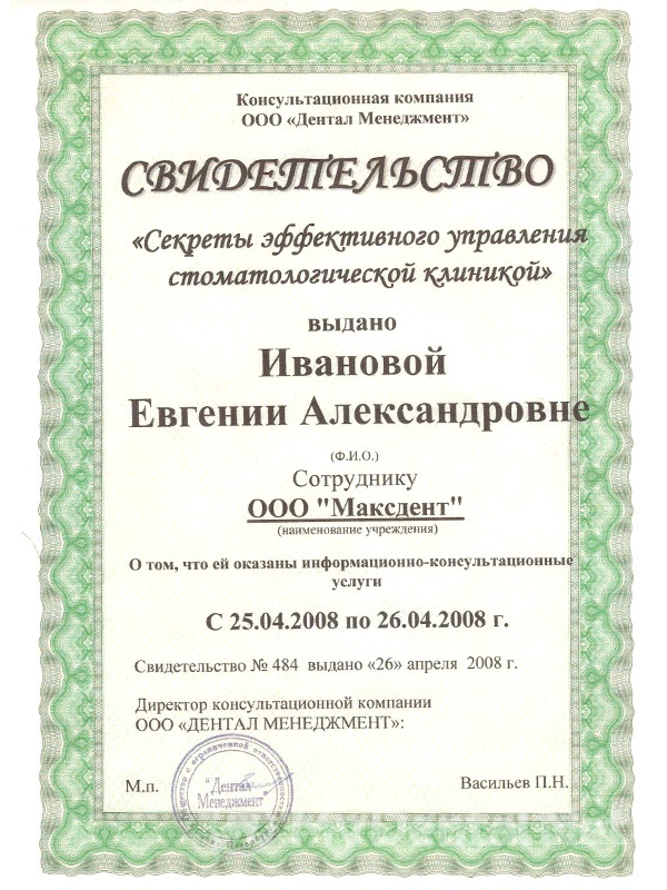 2008 г. — семинар «Секреты эффективного управления стоматологической клиникой».