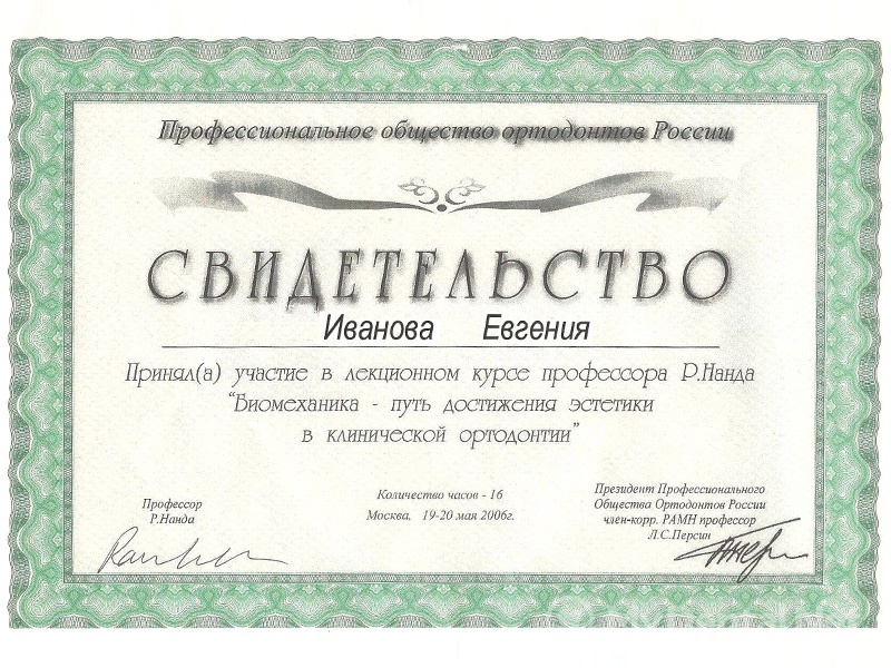 2007 г. — семинар «Стратегия и биомеханика ортодонтического лечения», Dr. Ravindra Nanda.