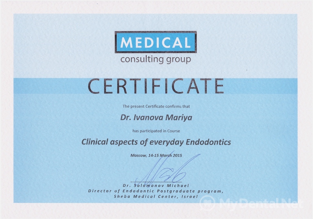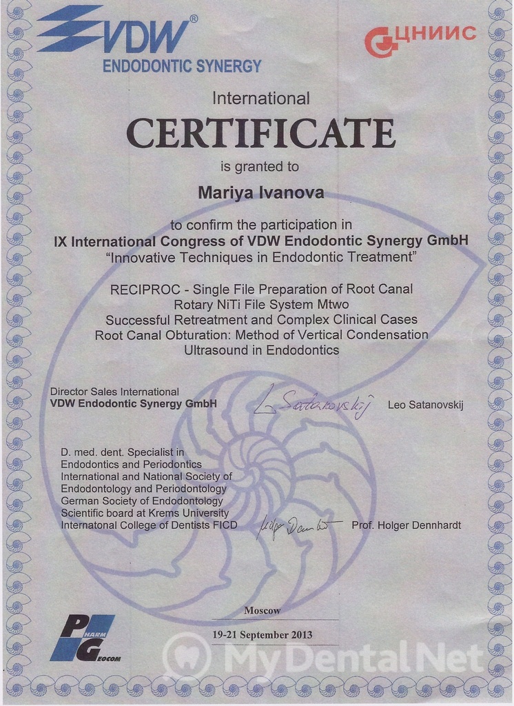 2013 год – сертификационный курс на тему "International congress of VDW Endodontic Synergy GmbH".