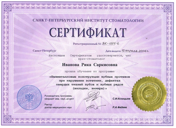 2006г — «Безметалловые конструкции зубных протезов при нарушении эстетики, дефектах твердых тканей зубов и зубных рядов (вкладки-виниры)» Санкт-Петербург