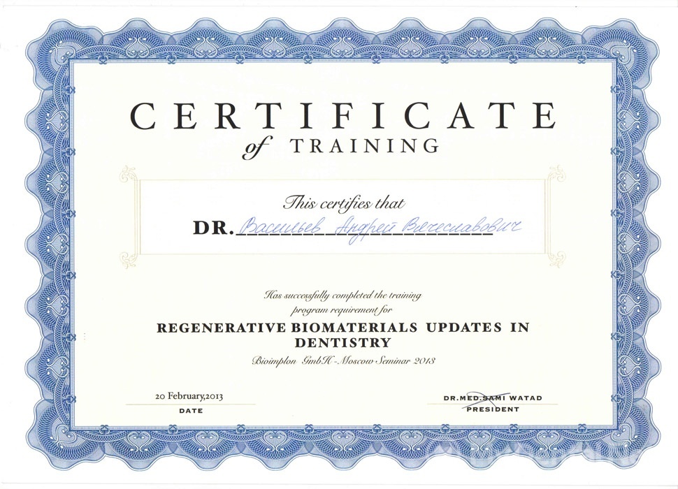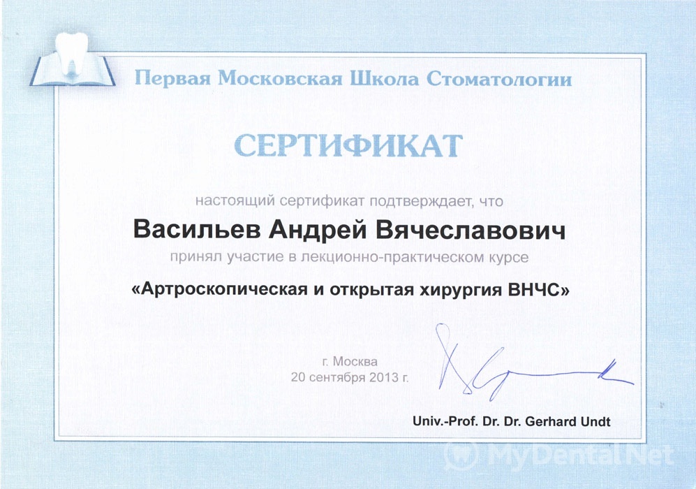 Прошел практические курсы курсы по имплантации, костной пластике, синус-лифтингу, устранению рецессий десны, пластике мягких тканей вокруг имплантатов, эндоскопическим способам лечения в/ч синуситов, патологий ВНЧС.