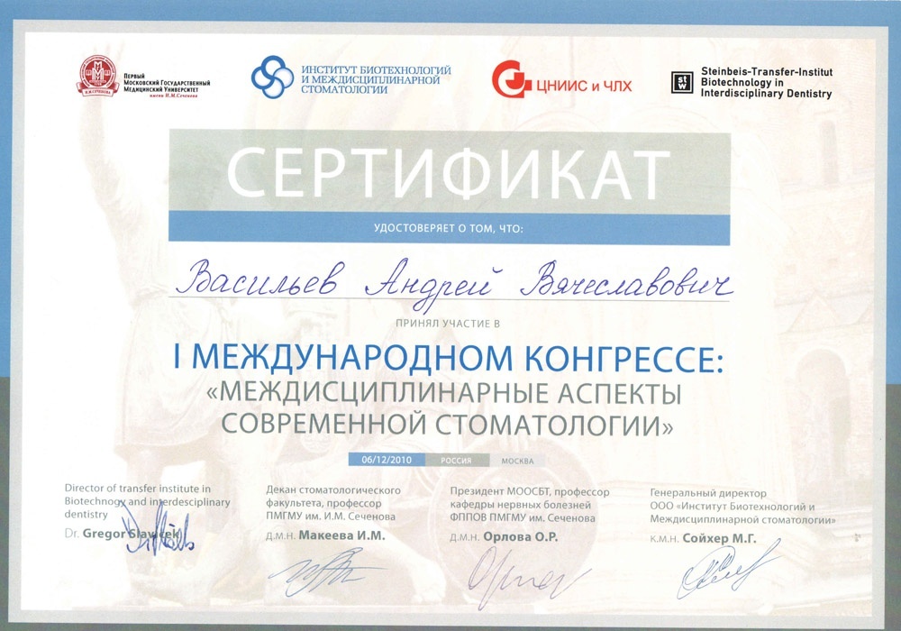 Сертификат участника I Международного конгресса "Междисциплинарные аспекты современной стоматологии"