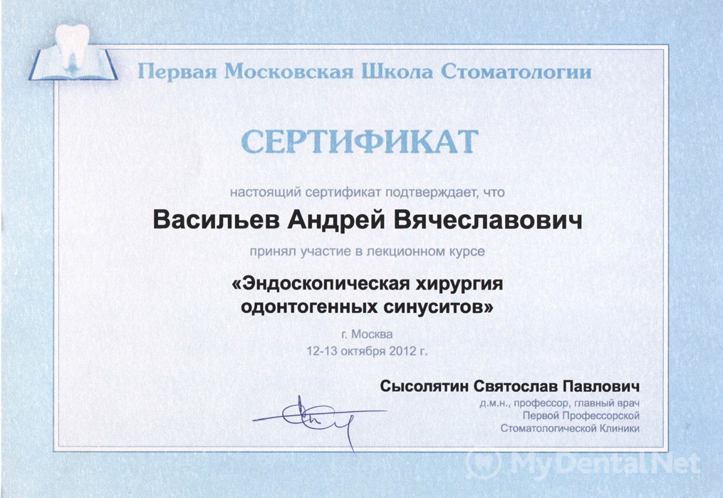 Сертификат участника лекционно-практического курса "Эндоскопическая хирургия одонтогенных синуситов"