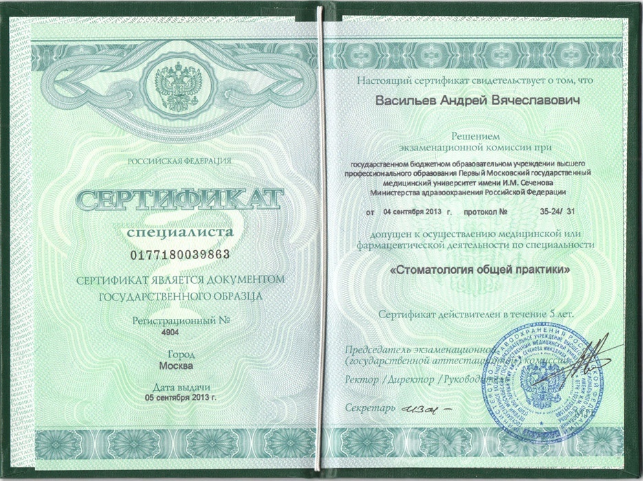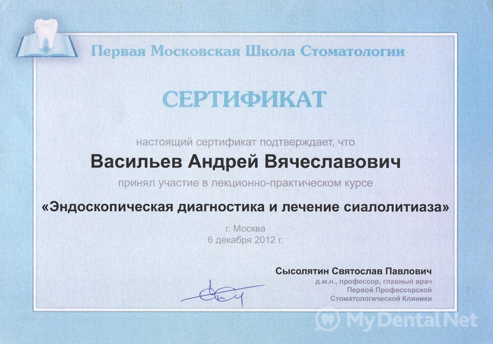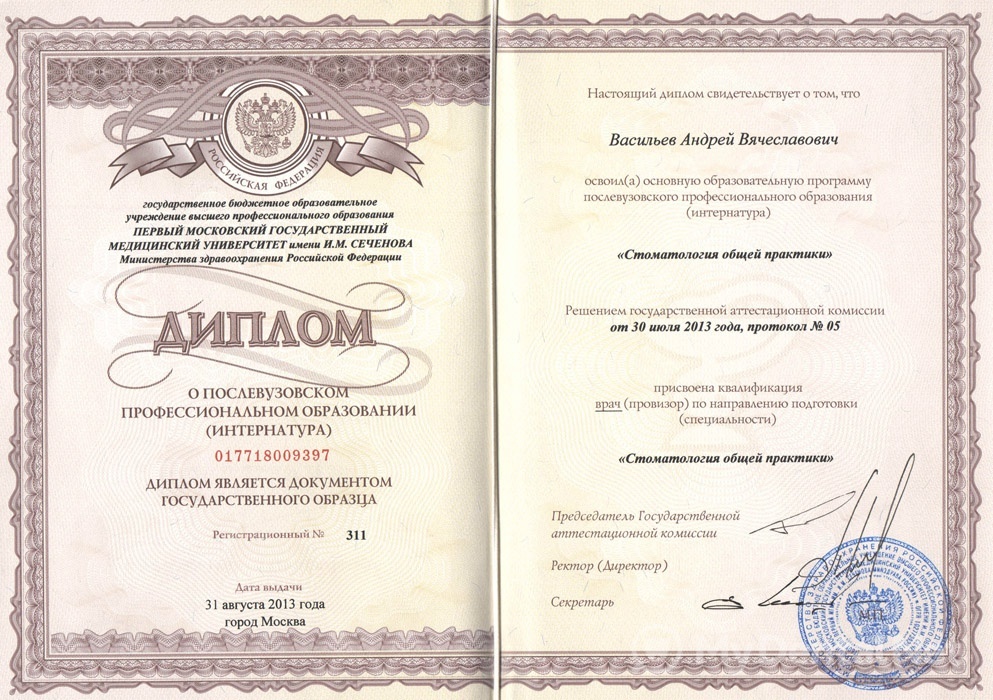 - общая стоматология (Интернатура: Первый МГМУ им И.М. Сеченова, кафедра Факультетской хирургической стоматологии;