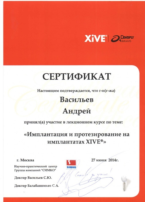 Сертификат участника лекционного курса "Имплантация и протезирование на имплантатах XIVE"