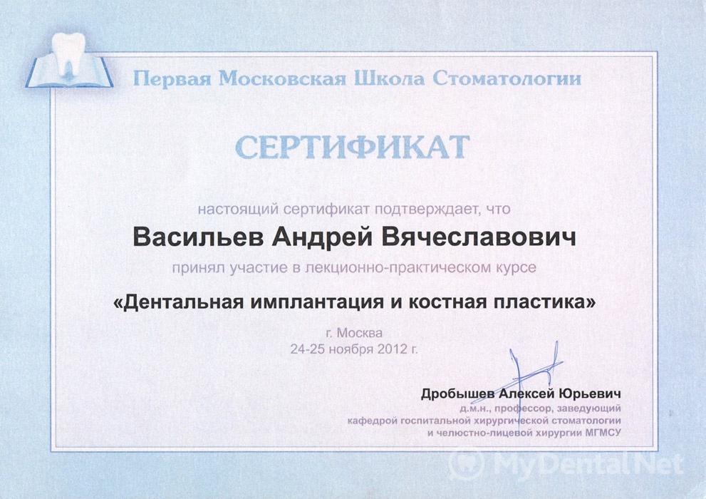 - хирургическая стоматология (Ординатура: Первый МГМУ им И.М. Сеченова, кафедра Факультетской хирургической стоматологии).