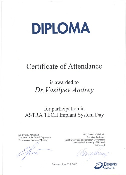 Certificate of Attendance for participation in "ASTRA TECH implant System Day"