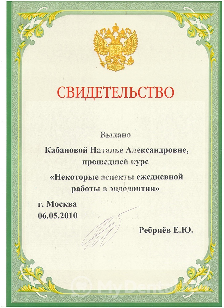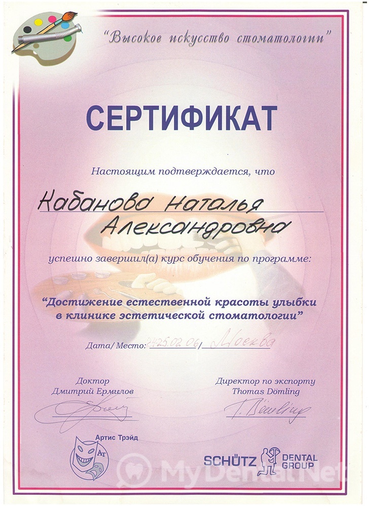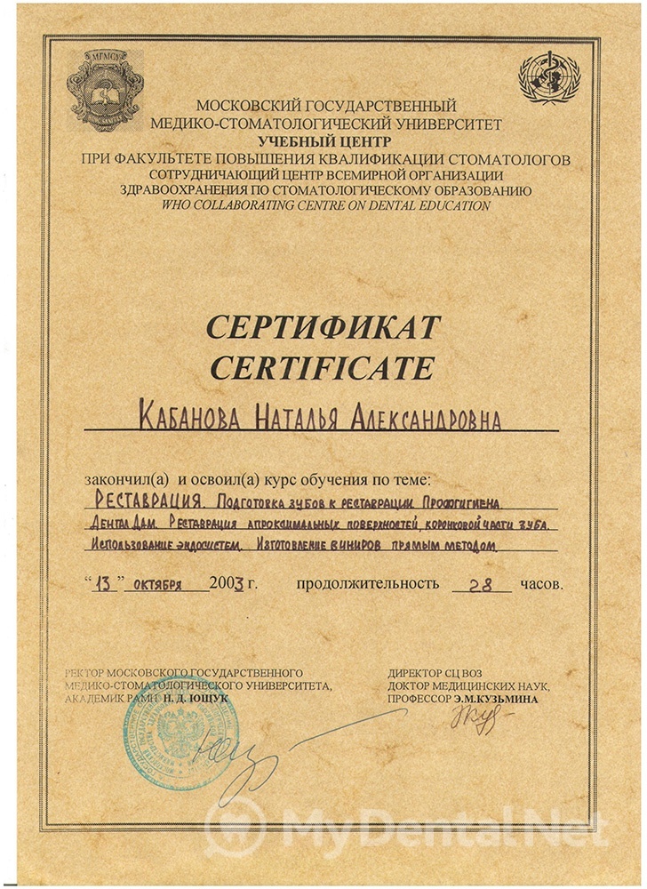 Образование: закончила Тверскую государственную медицинскую академию, продолжила последипломное образование в интернатуре по специализации «Стоматология общей практики», в ординатуре по специализации «Стоматология терапевтическая». За время работы неоднократно проходила сертифицированные курсы по современным методам терапевтического лечения у российских и зарубежных специалистов.