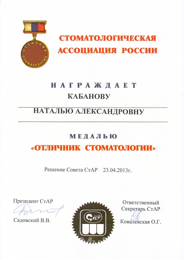 Награды: в 2013 году награждена медалью «Отличник стоматологии»