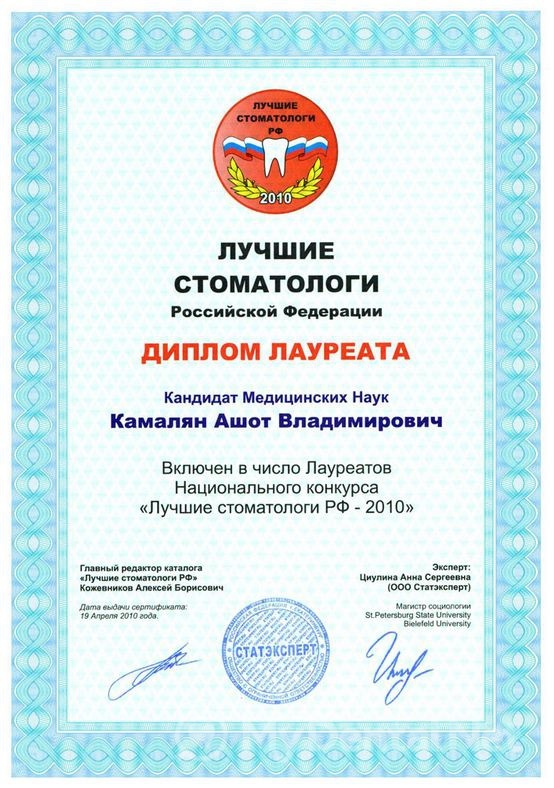 2010 СТАТЭКСПЕРТ (Россия, Екатеринбург) - Награжден дипломом Лауреат национального конкурса "Лучшие стоматологи Р.Ф.2010"