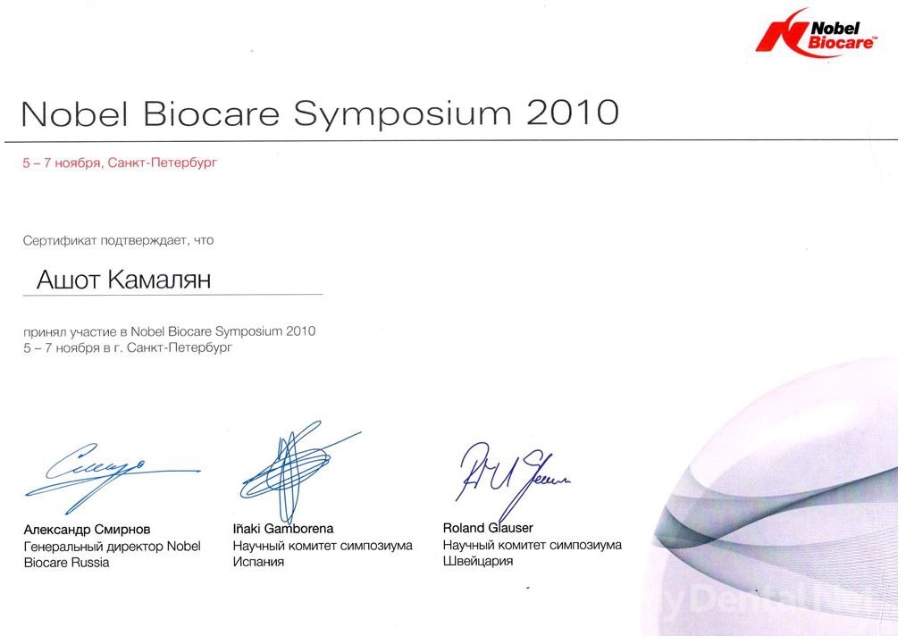 2010 Nobel Biocare - Сертификат участника симпозиума