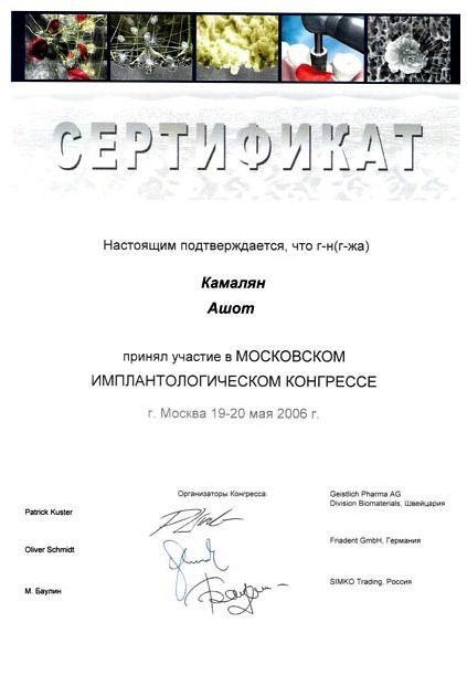 2006 Московский Имплантологический Конгресс (Россия, Москва) - Сертификат