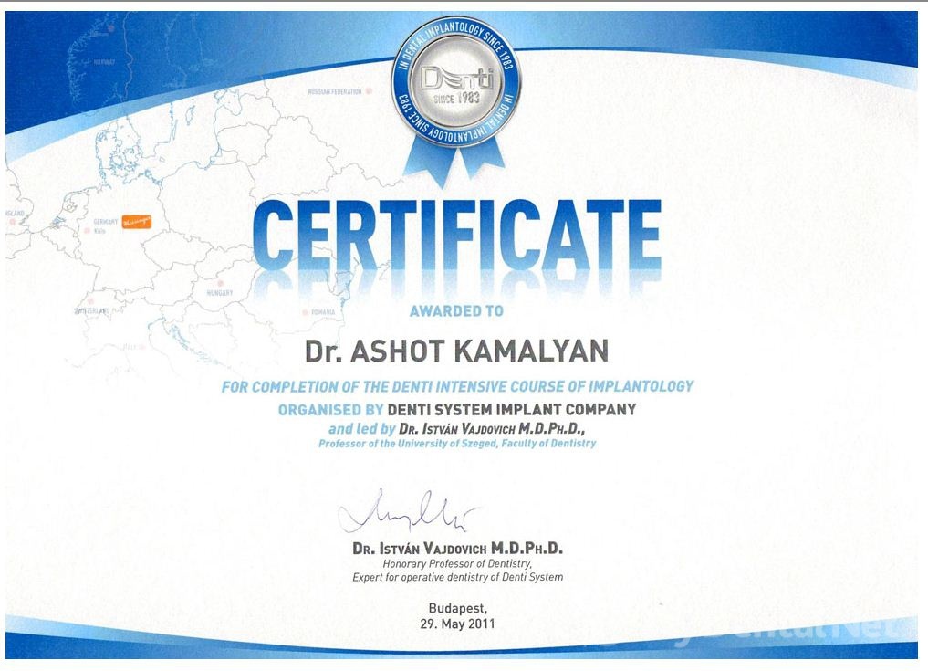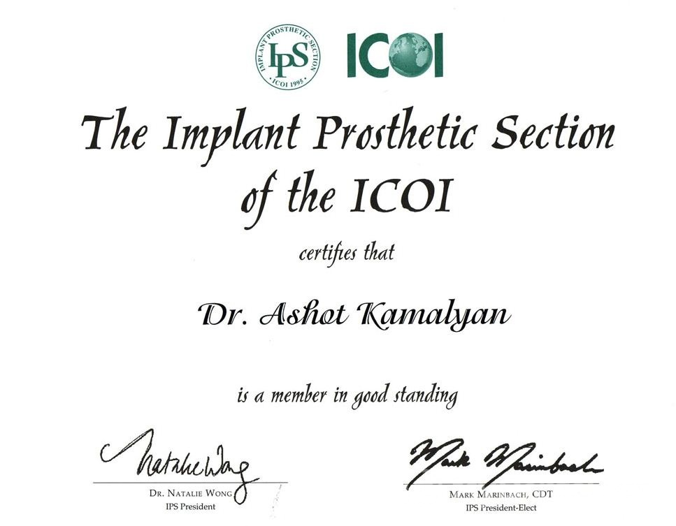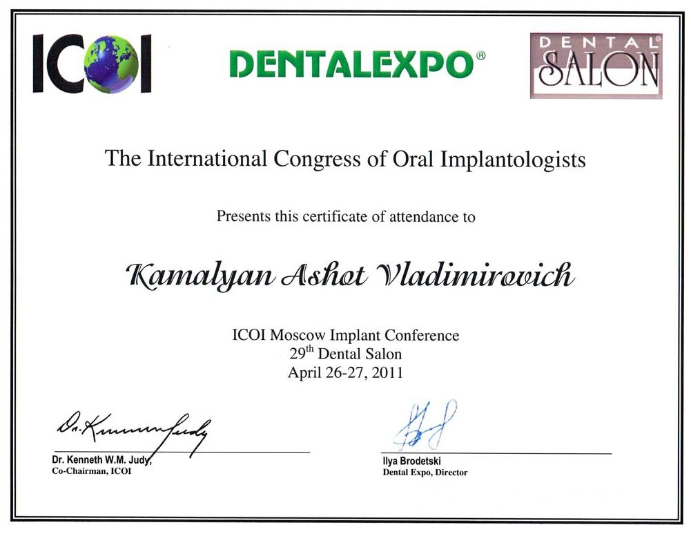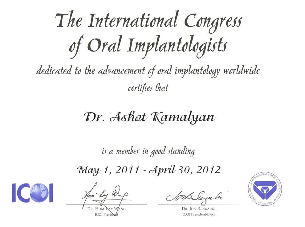 2011 Действительный член «ICOI»-Международная Ассоциациия Имплантологов - Сертификат