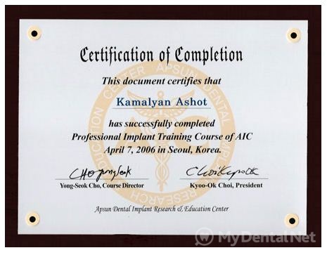2006 Apsun Dental Implant Research & Education Center (Korea, Seoul) - Сертификат