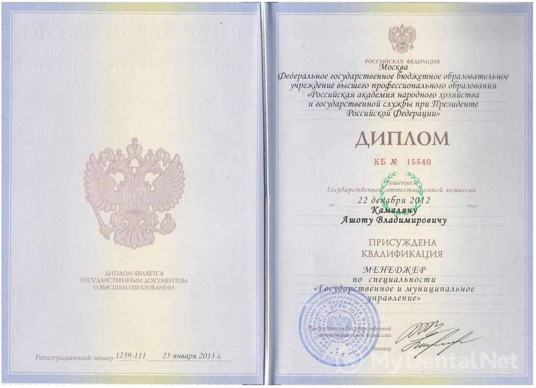 2012 Федеральное Государственное Бюджетное Образовательное Учреждение Высшего Профессионального Образования«Российская Академия народного хозяйства и государственной службы при Президенте РФ» - Диплом о присуждение квалификации Менеджер по специальности«Государственное и муниципальное Управление»