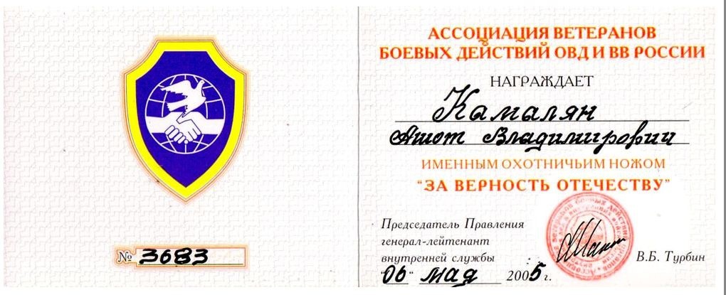 - Удостоверение о награждении именным охотничьим ножом "За верность Отечеству"