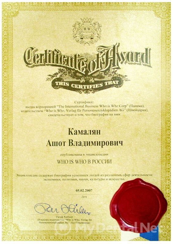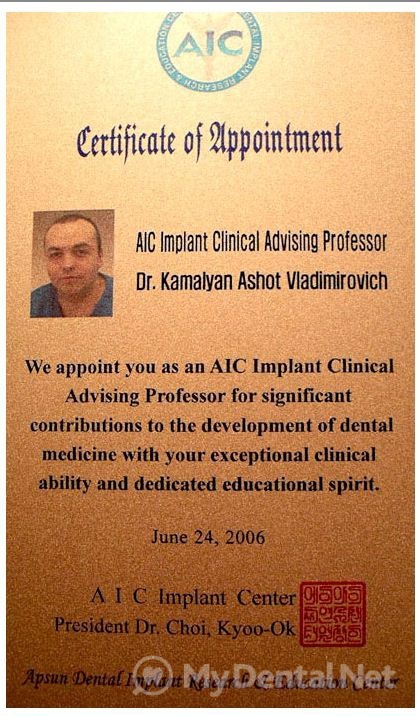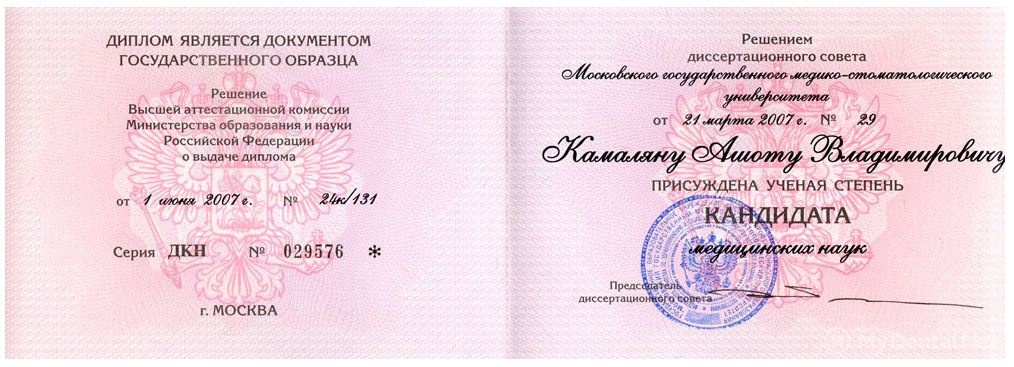 2007 Высшая аттестационная комиссия Росии (Россия, Москва) - Присвоена ученая степень Кандидата Медицинских Наук по 2-ум специальностям Стоматология и Судебная Медицина "Экспертные критерии оценки ошибок и осложнении при стоматологической имплантации".
