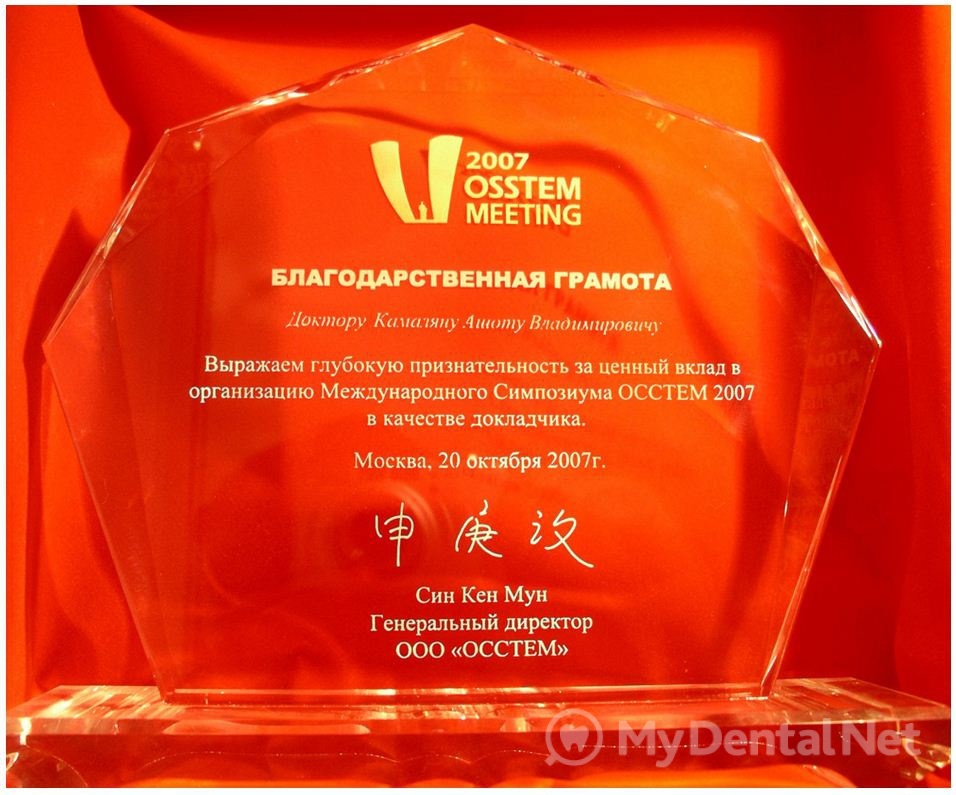 2007 Выступленте на международном имплантологическом симпозиуме OSSTEM MEETING 2007(Korea, Seoul) - Сертификат докладчика, награды.
