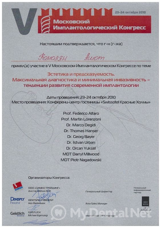 2010 Московский Имплантологический Конгресс - Сертификат участника конгресса