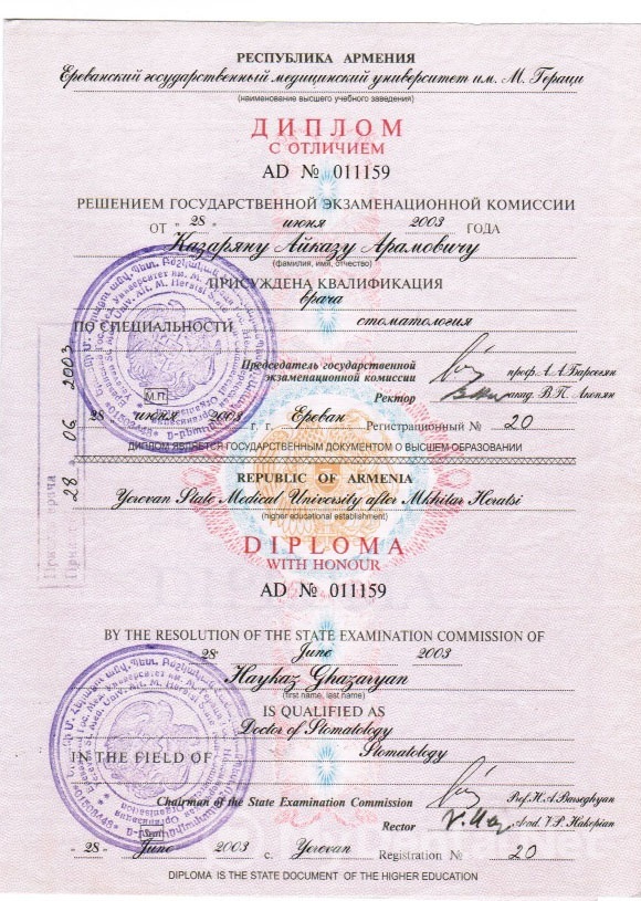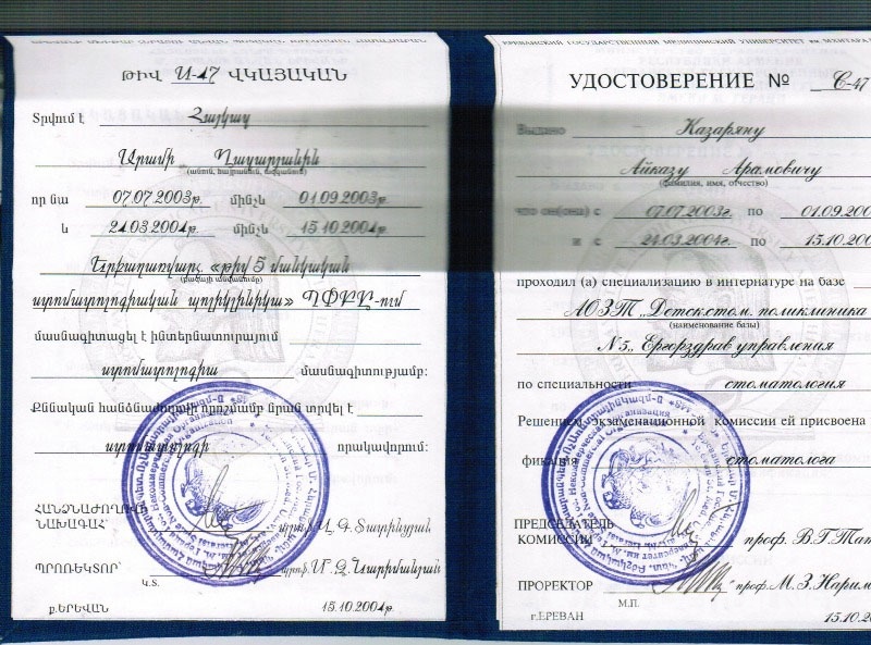 •2003-2004 интернатура на кафедре госпитальной терапевтической стоматологии Ереванского государственного медицинского университете им. Махатара Герасы