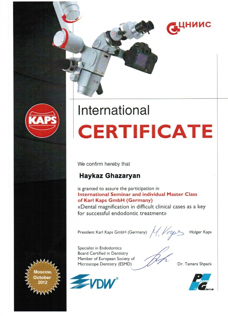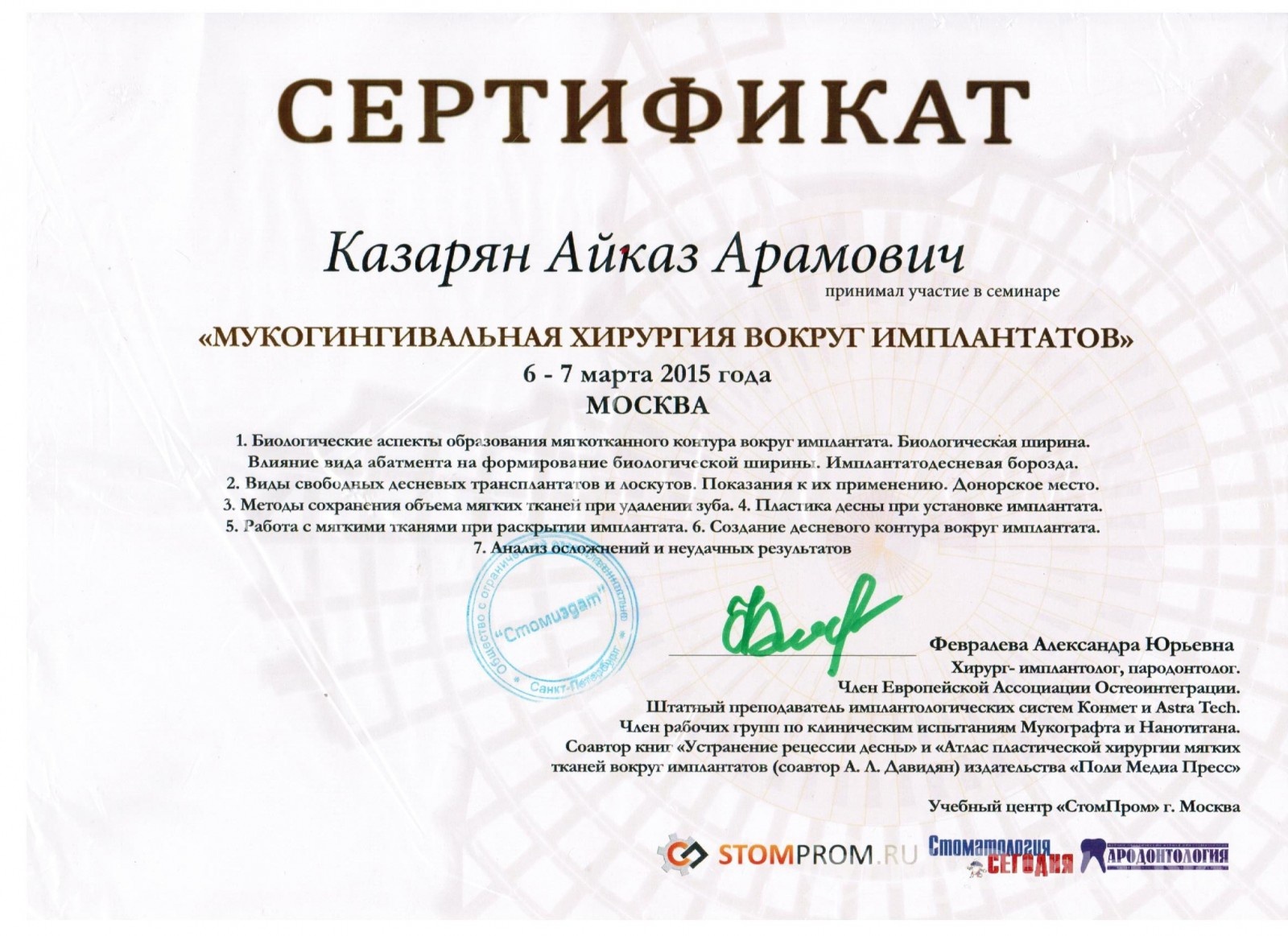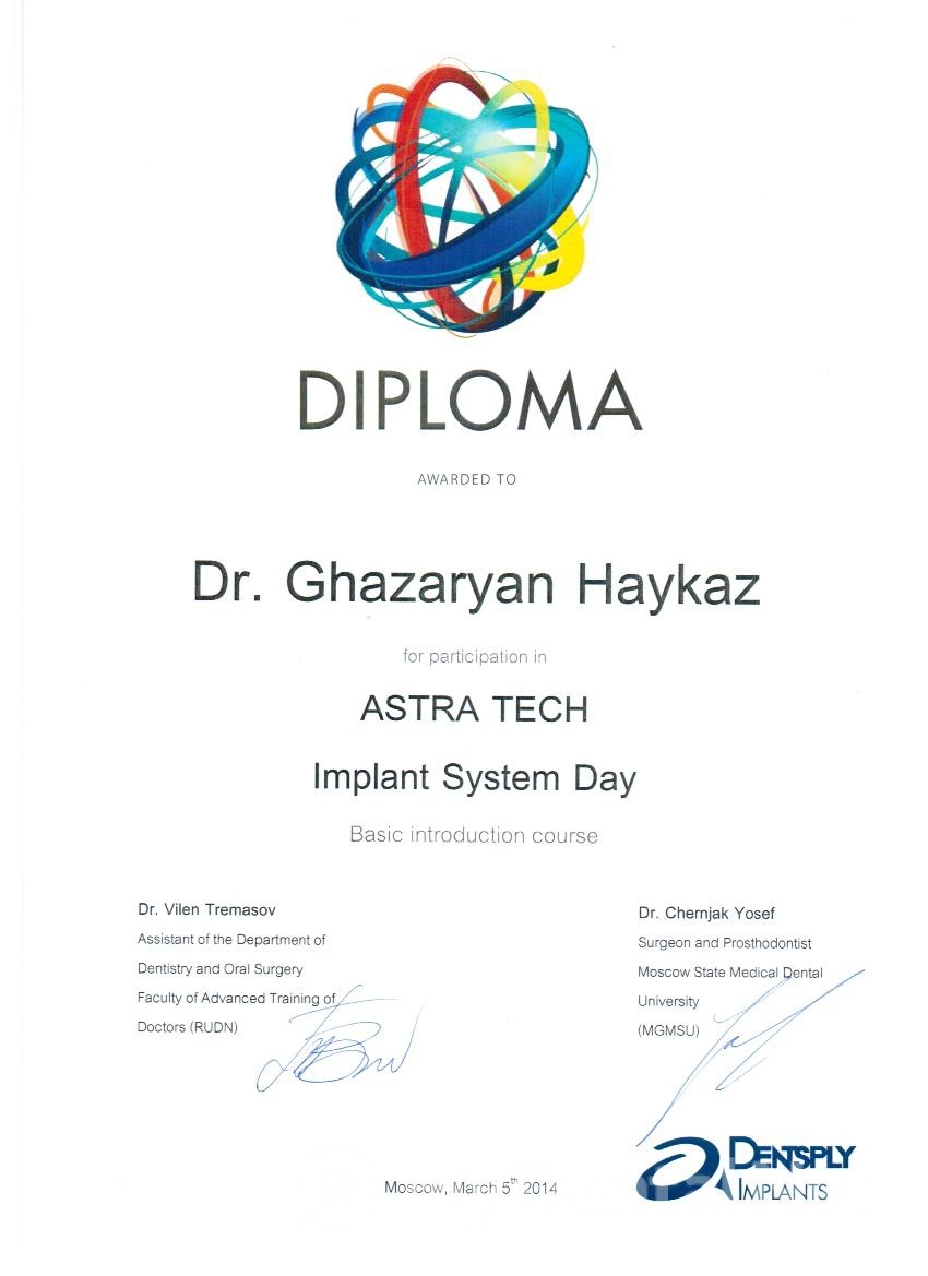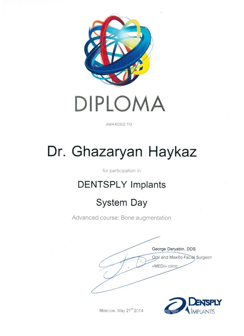 • Диплом об участии в учебном курсе DENTSPLY IMPLANTS System Day Advanced course: Bone augmentation «Пластика дефектов альвеолярного гребня аутогенными костными блоками с ветви и тела нижней челюсти, хирургический протокол,». 21 May 2014 г.
