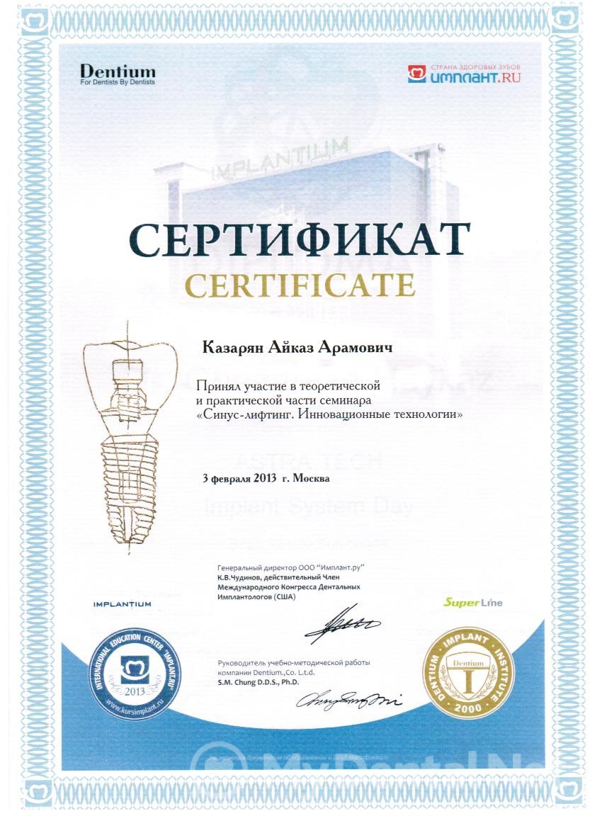 • Сертификат об участии в теоретической и практической части семинара «Синус-лифтинг. Инновационные технологии» 2013-04-07