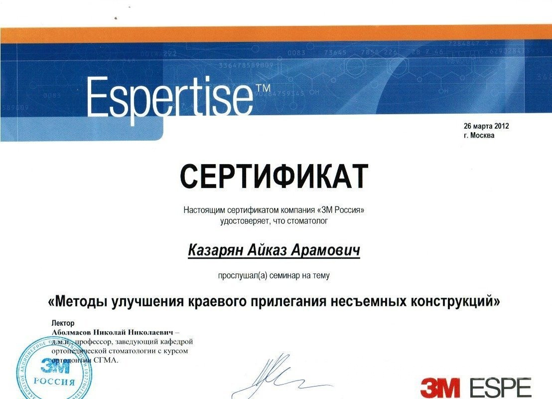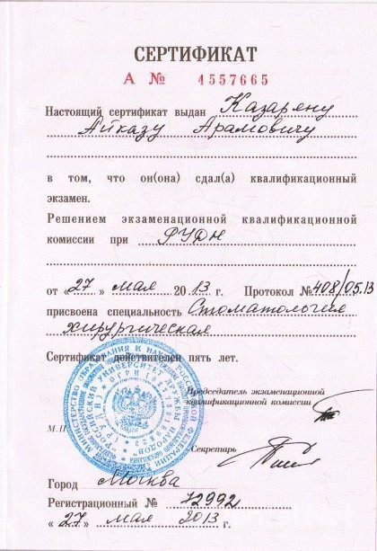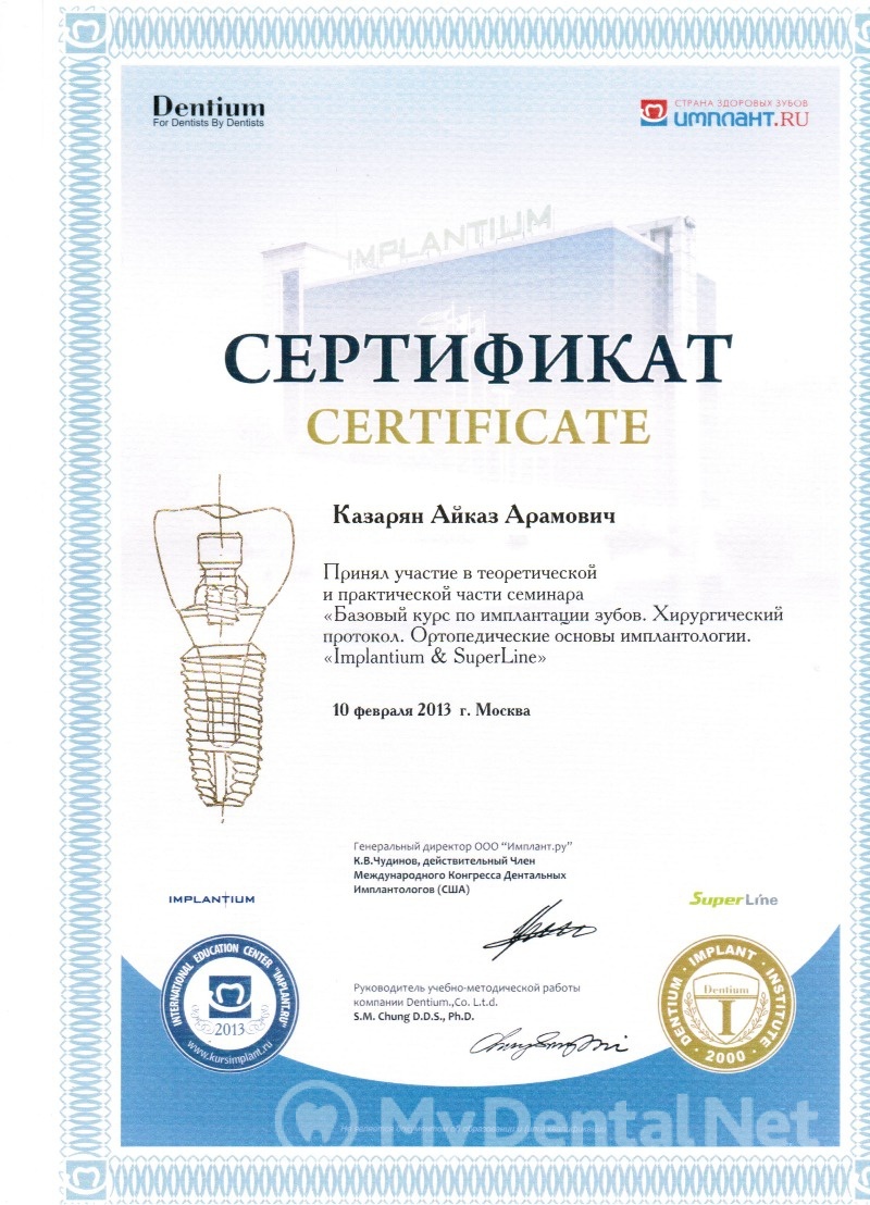 • Сертификат об участии в семинаре « Базовый курс по имплантации. Хирургический протокол. Ортопедический основы имплантологии. «Implantium SuperLine» 2013